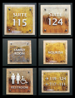 for Hospice that incorporated pleasant mood themes with natural elements. John Curtis Photography, was incorporated into the signs. The images were subsurface so that they could not be scratched with decorative hardware matching light sconce and door latch, mounted to earth tone gold travertine. Each room had a different image as well as public area signage. In an environment where there is “heaviness", it is nice to help lighten the mood.