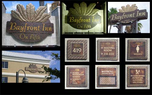 nestled on a bay, this complete turnkey interior/exterior sign system utilizes sustainable materials. Hand carved logo with graphics with cast resin plaques and wicker, faux bronze finish matching interior décor.