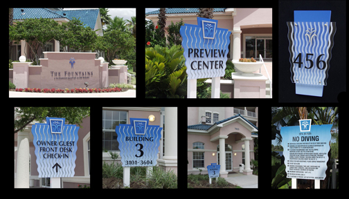 The FountainsOrlando, FL Fountains required a colorful contemporary water pattern to mimic their water features, and accent colors to integrate the signage. We created glass-like faces to mimic waves and a carved design in the underside of the face, which had tactile and Braille graphics with an off-set face using stainless steel decorative hardware.