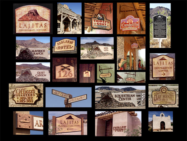 Lajitas Golf ResortLajitas, TX Lajitas is a large residential community resort and golf course with the Rio Grande running through it bordering Mexico. We created an entire sign program for the community from highway monument ID’s, traffic street and regulatory, hotel and restaurants in a rustic theme. The famous Marlborough Man commercials were shot in front of Lajitas Rock in town.