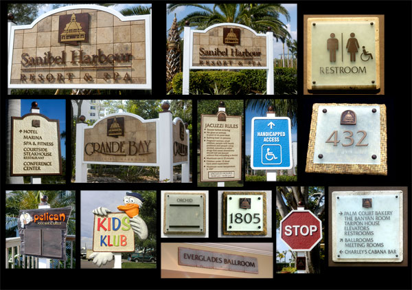 Sanibel HarbourFt. Meyers, FL The sign system for this Marriott resort was designed in collaboration with Meg Prendergast at The Gettys Group 2006 ARDA Travertine stone was used throughout the property with acrylic faceplates, bronzed tactile lettering and hardware, including Braille. Complete turnkey sign system including planning, design, fabrication, and installation. |