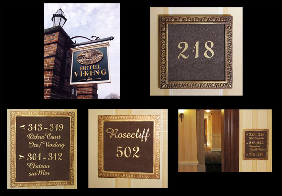 Viking HotelNewport, RIInterior/exterior sign system. Interior signs were designed with cast resin frames with matching faux bronze antique finish panel face-plates with leathered vinyl and brass graphics with Braille for ADA compliancy.