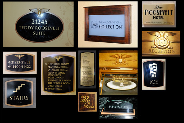 Waldorf RooseveltNew OrleansDesign collaboration with This historic property required close collaboration and incorporation of elements from the original Roosevelt Hotel theme. It also required replicating the trademark eagle element, which was carved, cast, and incorporated into all the signage. Signs were water-jet cut from solid black granite. Complete turnkey sign system, including planning, design, manufacturing, and installation.